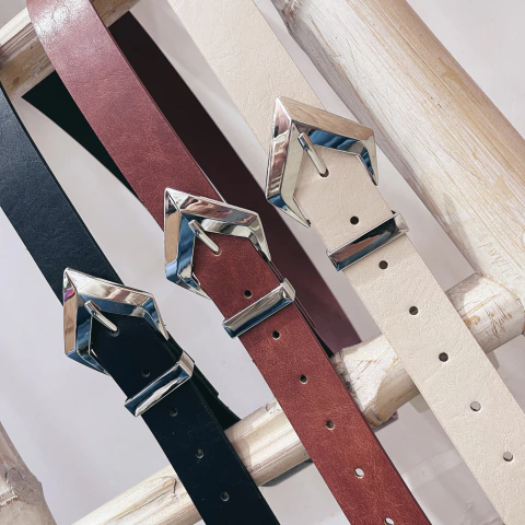 Cinturón de cuero ecológico con hebilla color plata. Viene talle único, se adapta de 92cm a 115cm de contorno de cintura.